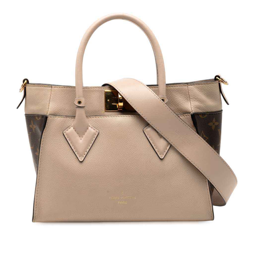 The On My Side PM features a leather body with monogram canvas side panels, rolled leather handles, a detachable flat leather strap, an open top with twist lock closure, exterior slip pockets, and interior slip and zip pockets.