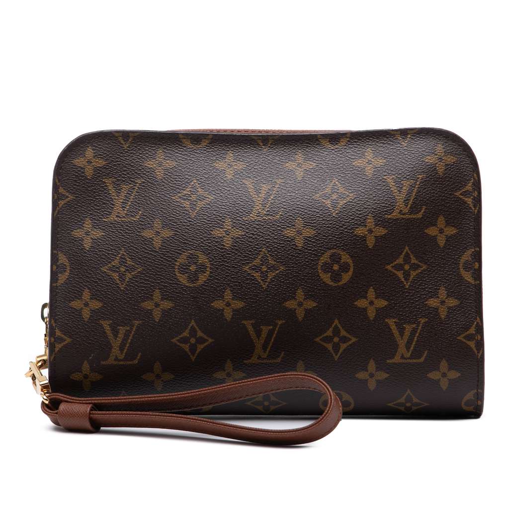 The Orsay features a monogram canvas body, a detachable leather wrist strap, a zip around closure, an exterior slip pocket, and an interior slip pocket.