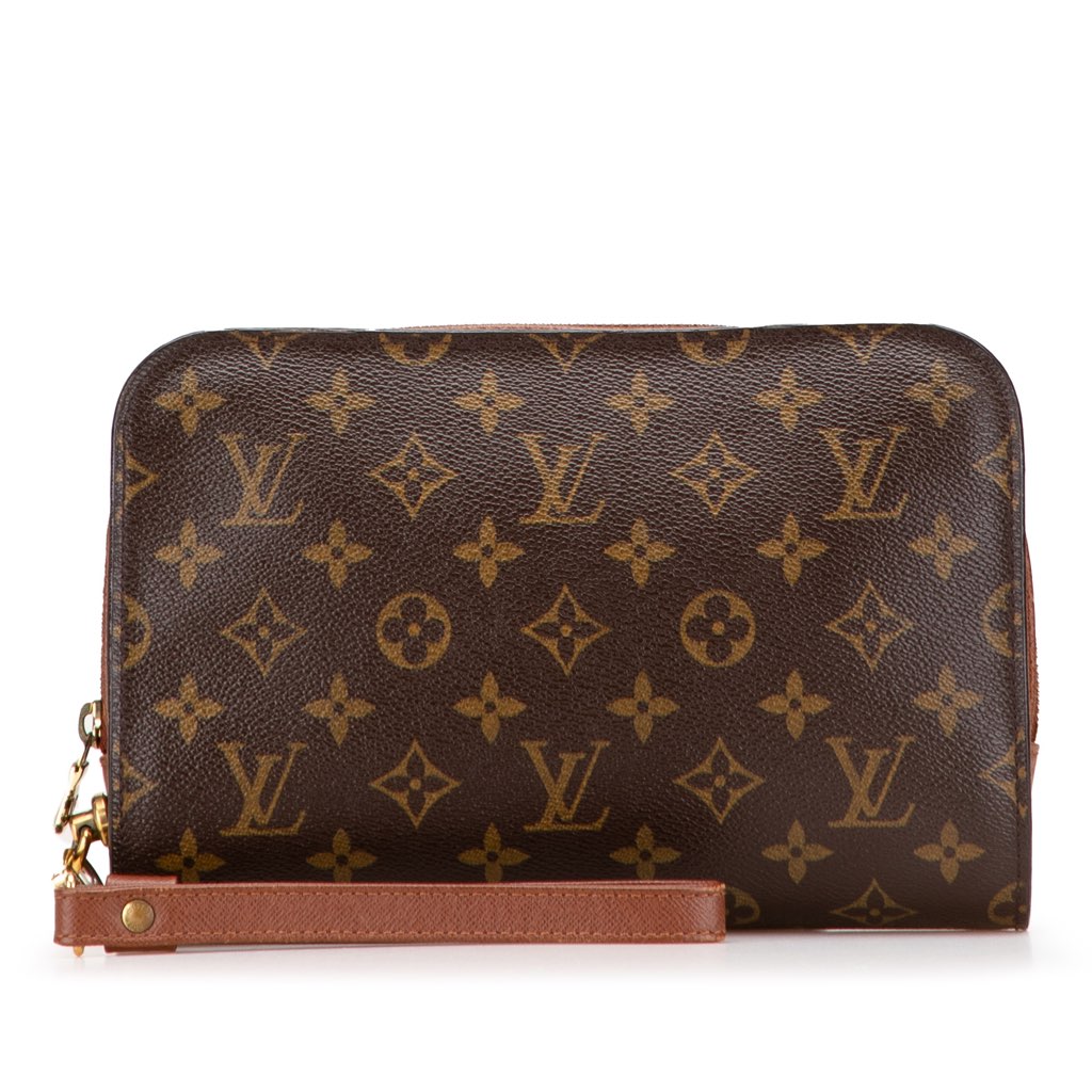 The Orsay features a monogram canvas body with leather trim, a flat leather wrist strap, a zip around closure, and an interior slip pocket.
