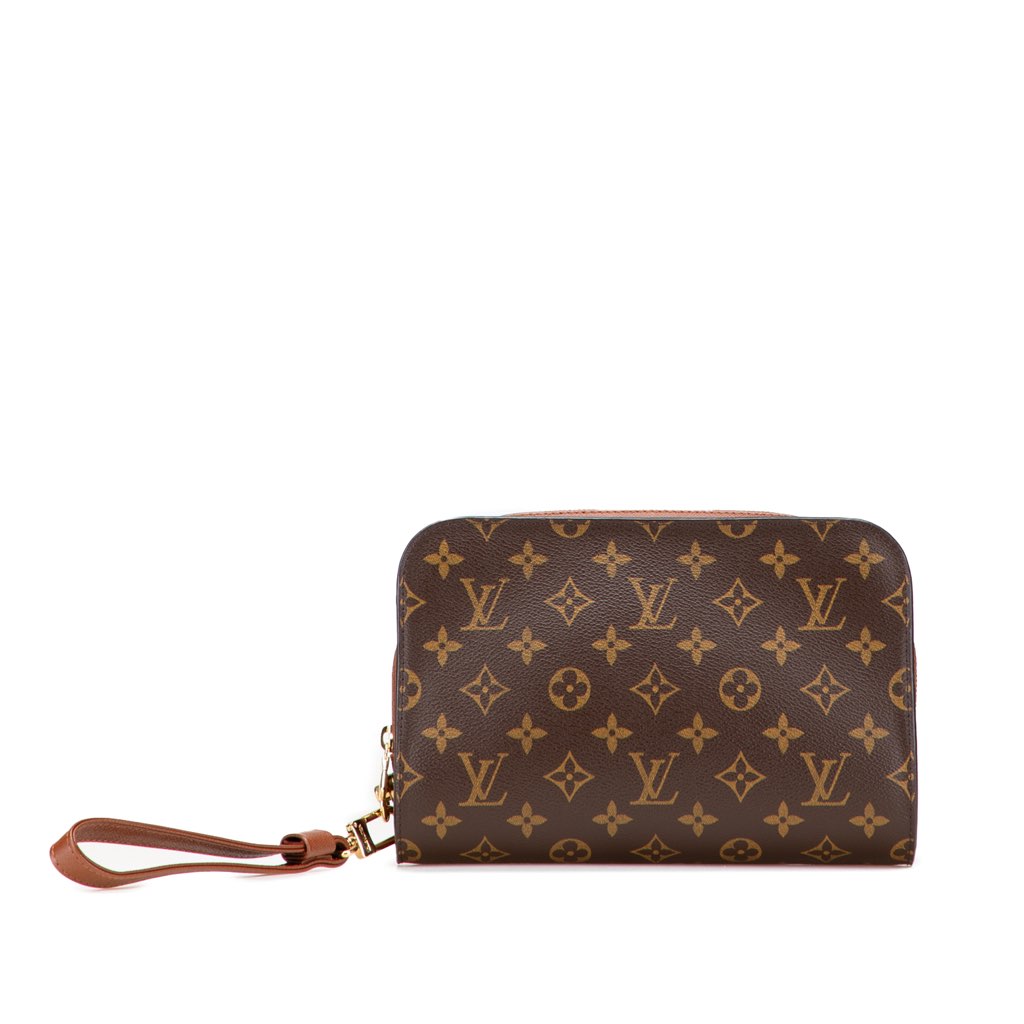 The Orsay features a monogram canvas body with leather trim, a detachable leather wrist strap, a zip around closure, an exterior slip pocket, and an interior slip pocket.