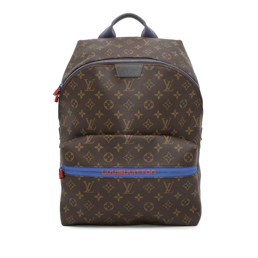 The Apollo backpack features a monogram canvas body, a flat handle, adjustable flat leather back straps, a top zip closure, an exterior front zip pocket, and interior slip pockets.