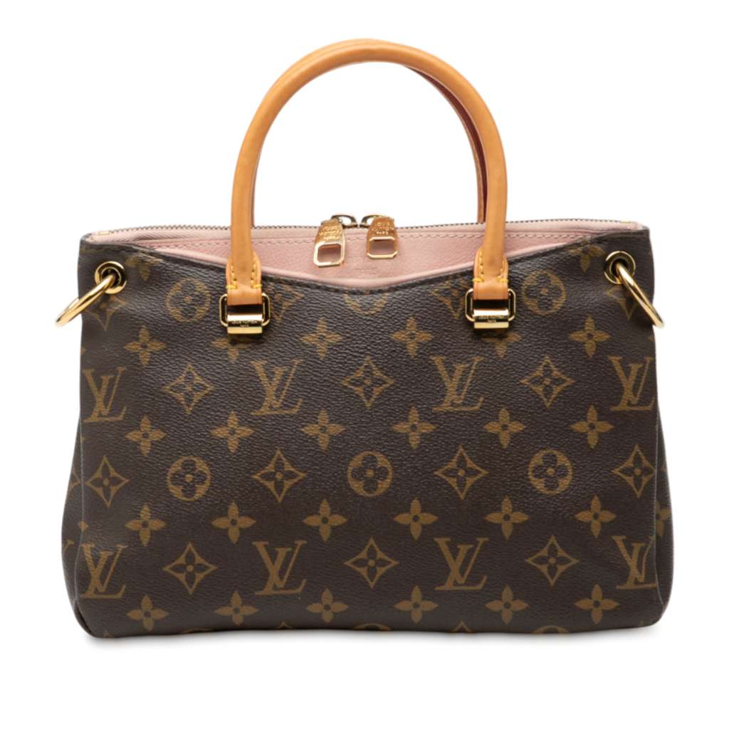 The Pallas satchel features a monogram canvas body with leather trim, rolled vachetta leather handles, a top zip closure, and interior slip and zip pockets.