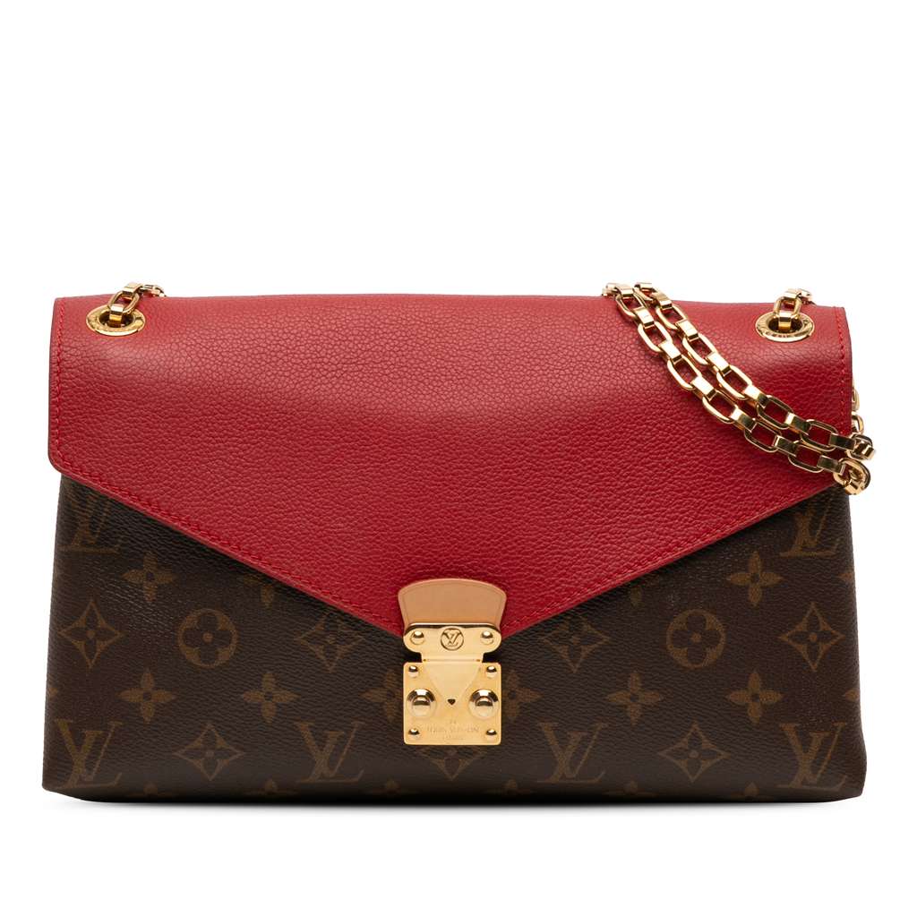 The Pallas Chain features a monogram canvas body, chain-link straps, a top leather flap with a push lock closure, and interior zip and slip pockets.