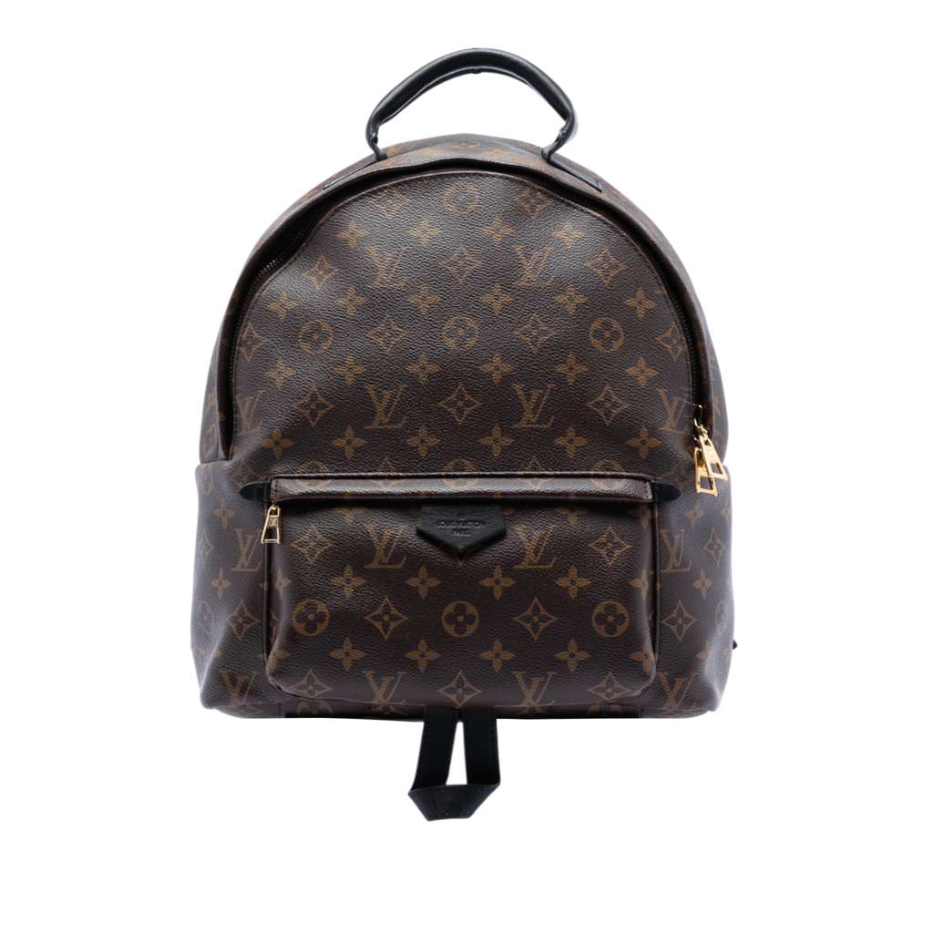 The Palm Springs MM features a monogram canvas body, a flat leather top handle, flat adjustable back straps, a top zip closure, an exterior front zip pocket, and an interior slip pocket.