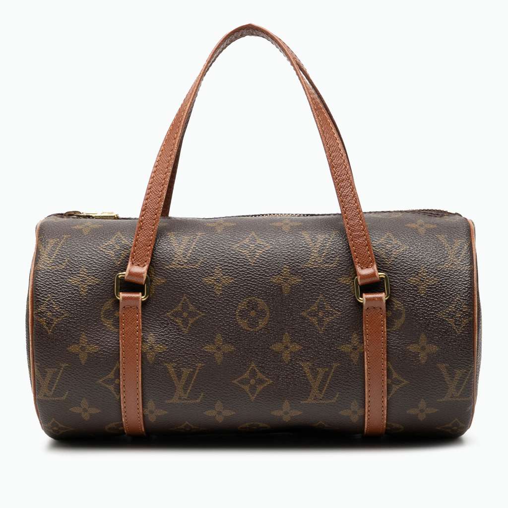 The Papillon 26 features a monogram canvas body, flat leather handles, and a top zip closure.