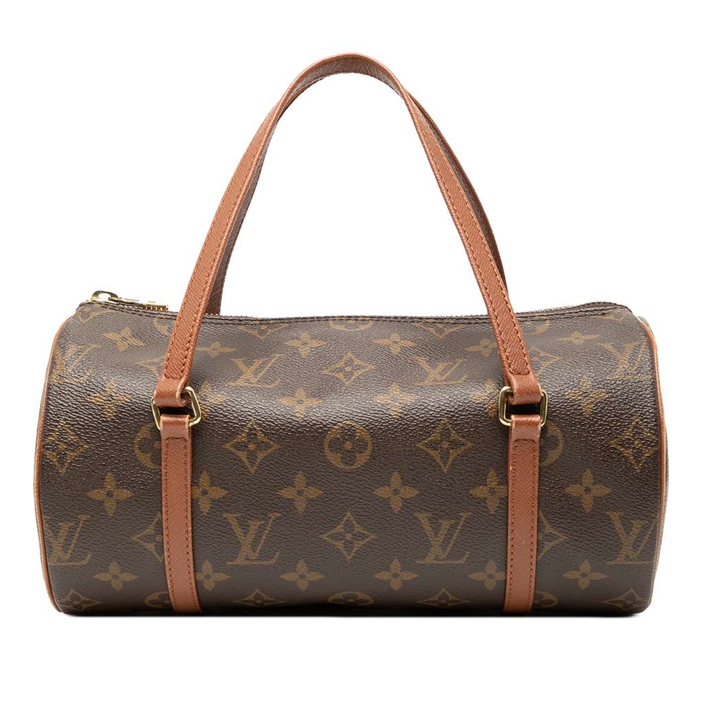 The Papillon 26 features a monogram canvas body, flat leather handles, and a top zip closure.