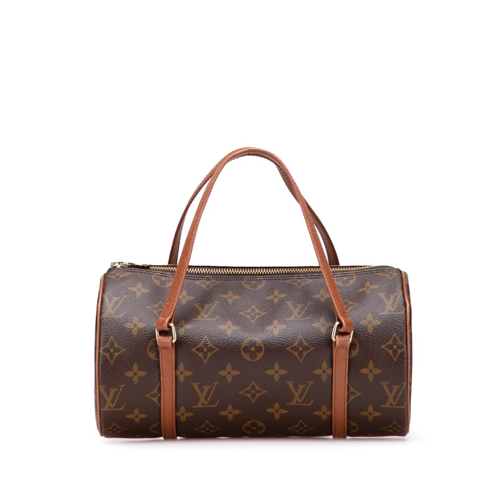 The Papillon 26 features a monogram canvas body with leather trim, flat leather handles, and a top zip closure.