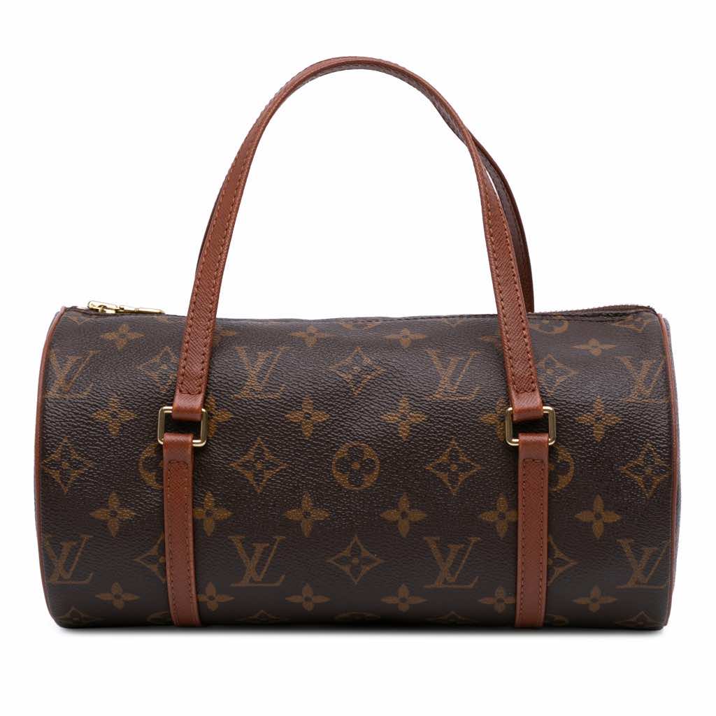The Papillon 26 features a monogram canvas body with leather trim, flat leather handles, and a top zip closure.