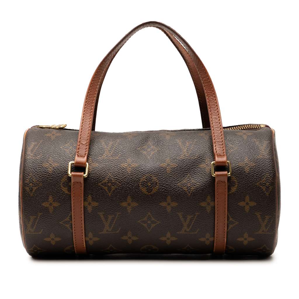 The Papillon 26 features a monogram canvas body, flat leather handles, and a top zip closure.