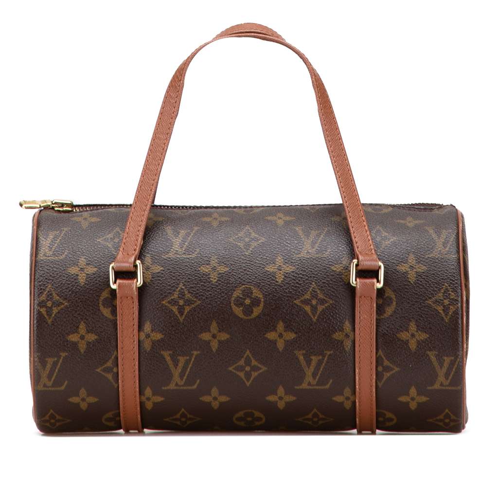 The Papillon 26 features a monogram canvas body with leather trim, flat leather handles, and a top zip closure.