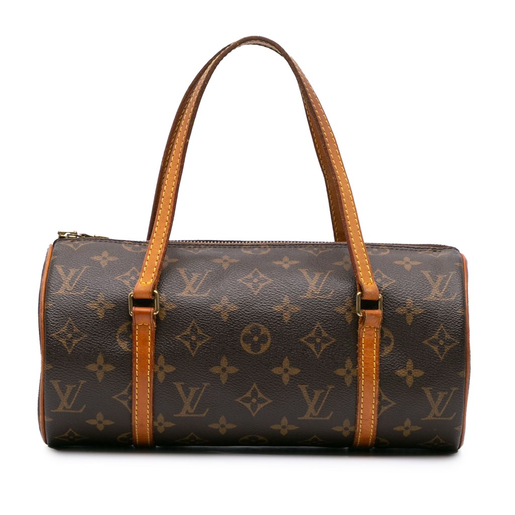 The Papillon 28 features a monogram canvas body with vachetta leather trim, flat vachetta leather handles, and a top zip closure.