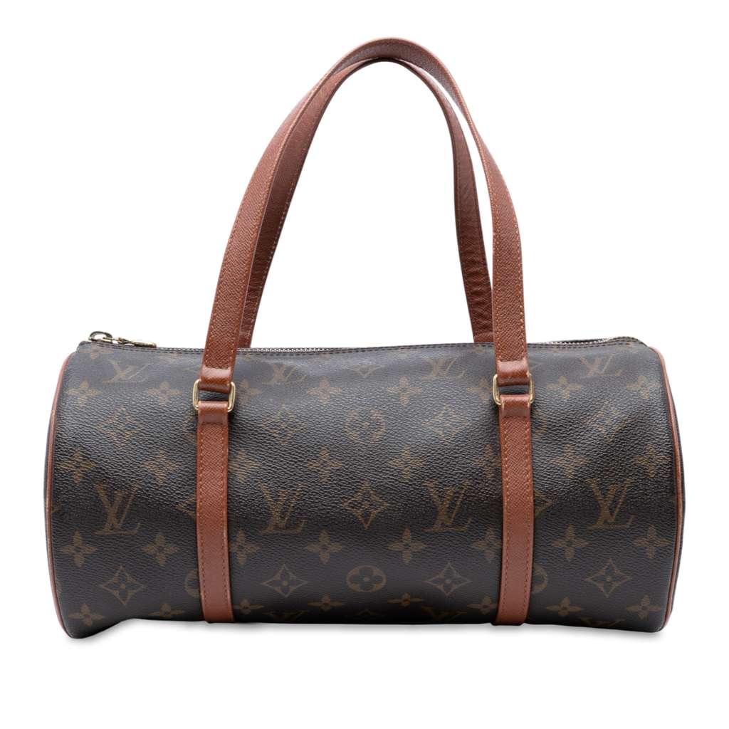 The Papillon 30 features a monogram canvas body with leather trim, flat leather handles, and a top zip closure.