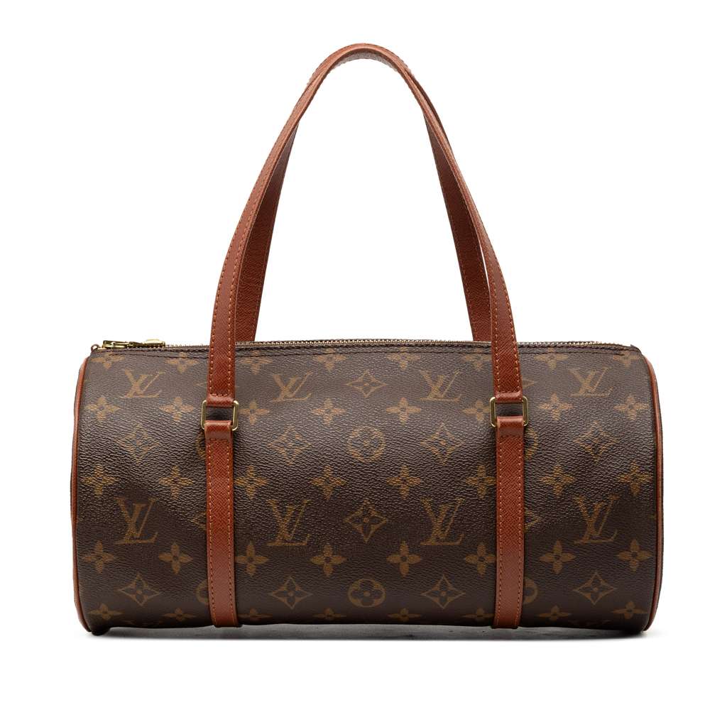 The Papillon 30 features a monogram canvas body with leather trim, flat leather handles, a top zip closure, and a pouch inclusion.