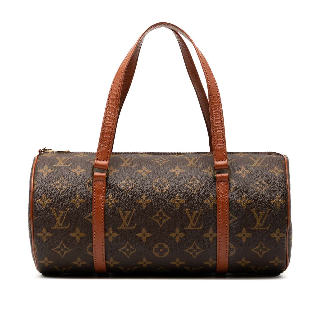 The Papillon 30 features a monogram canvas body, flat leather handles, and a top zip closure.