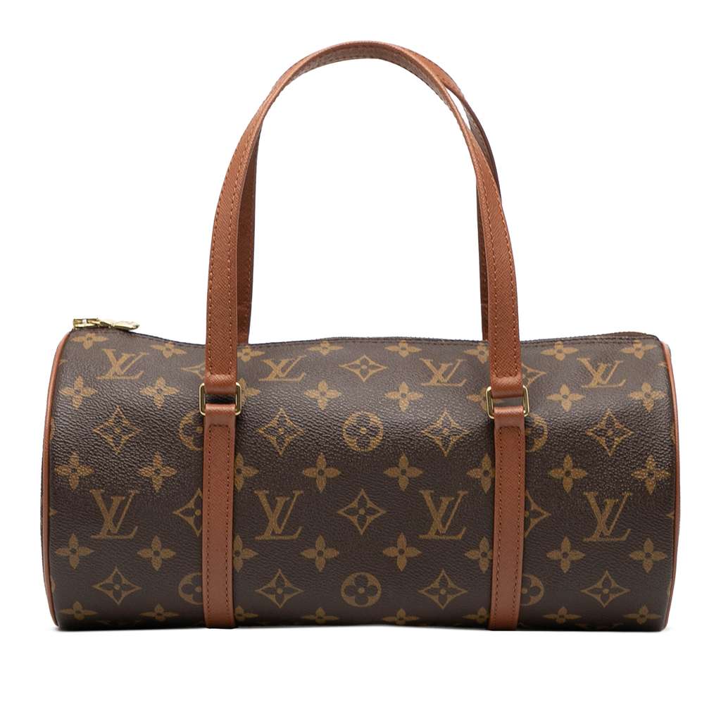 The Papillon 30 features a monogram canvas body, flat leather handles, and a top zip closure.