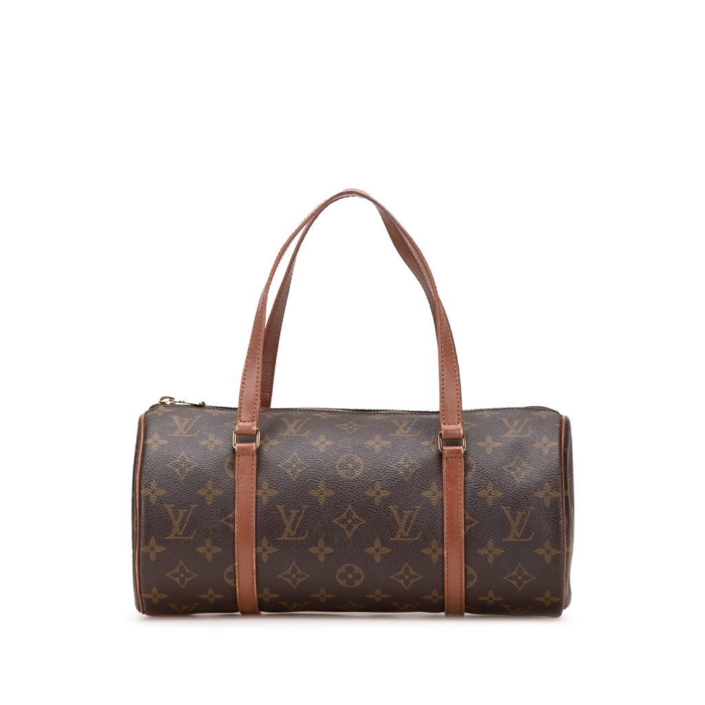 The Papillon 30 features a monogram canvas body with leather trim, flat leather handles, and a top zip closure.