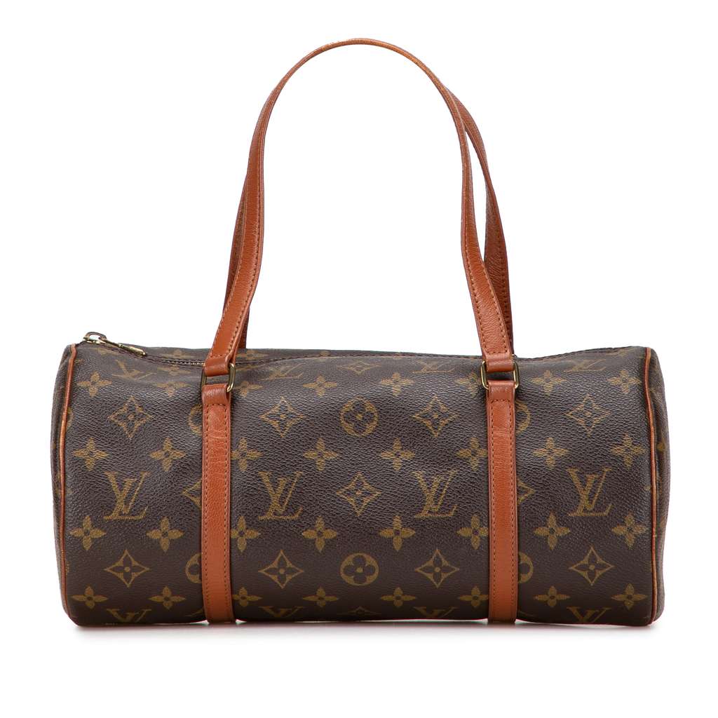 The Papillon 30 features a monogram canvas body with leather trim, flat leather handles, and a top zip closure.