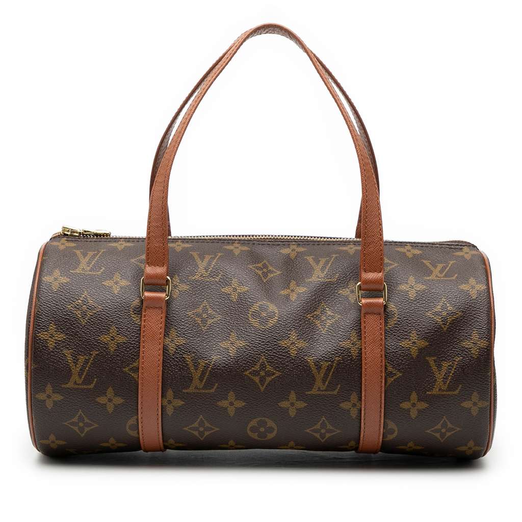 The Papillon 30 features a monogram canvas body with leather trim, flat leather handles, and a top zip closure.
