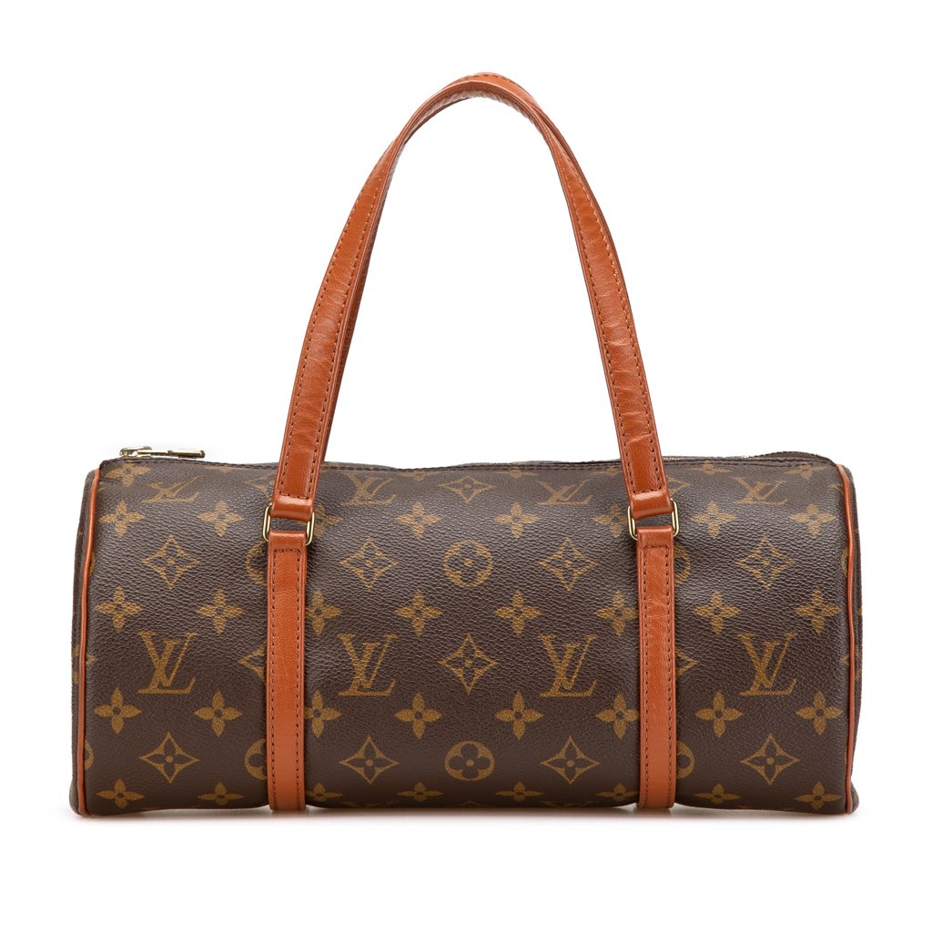 The Papillon 30 features a monogram canvas body with vachetta leather trim, flat vachetta leather handles, a top zip closure, and a pouch inclusion.
