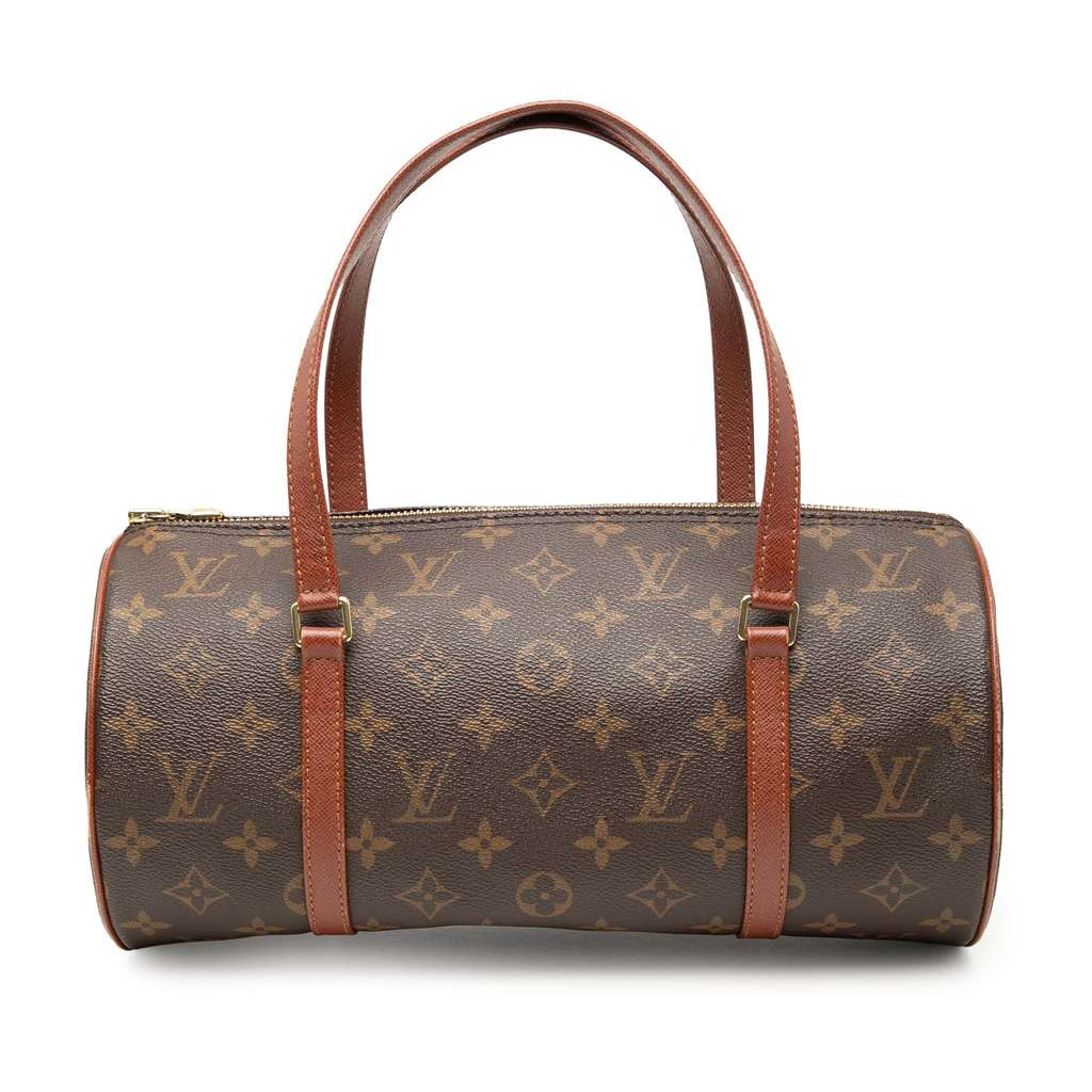 The Papillon 30 features a monogram canvas body, leather handles, and a top zip closure.