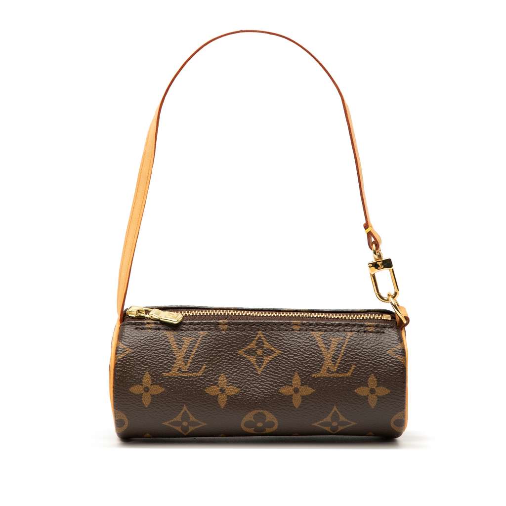 The Pochette Papillon features a monogram canvas body, a flat vachetta leather strap, and a top zip closure.