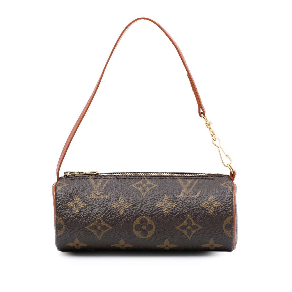 The Papillon Pochette features a monogram canvas body, a flat leather strap, and a top zip closure.