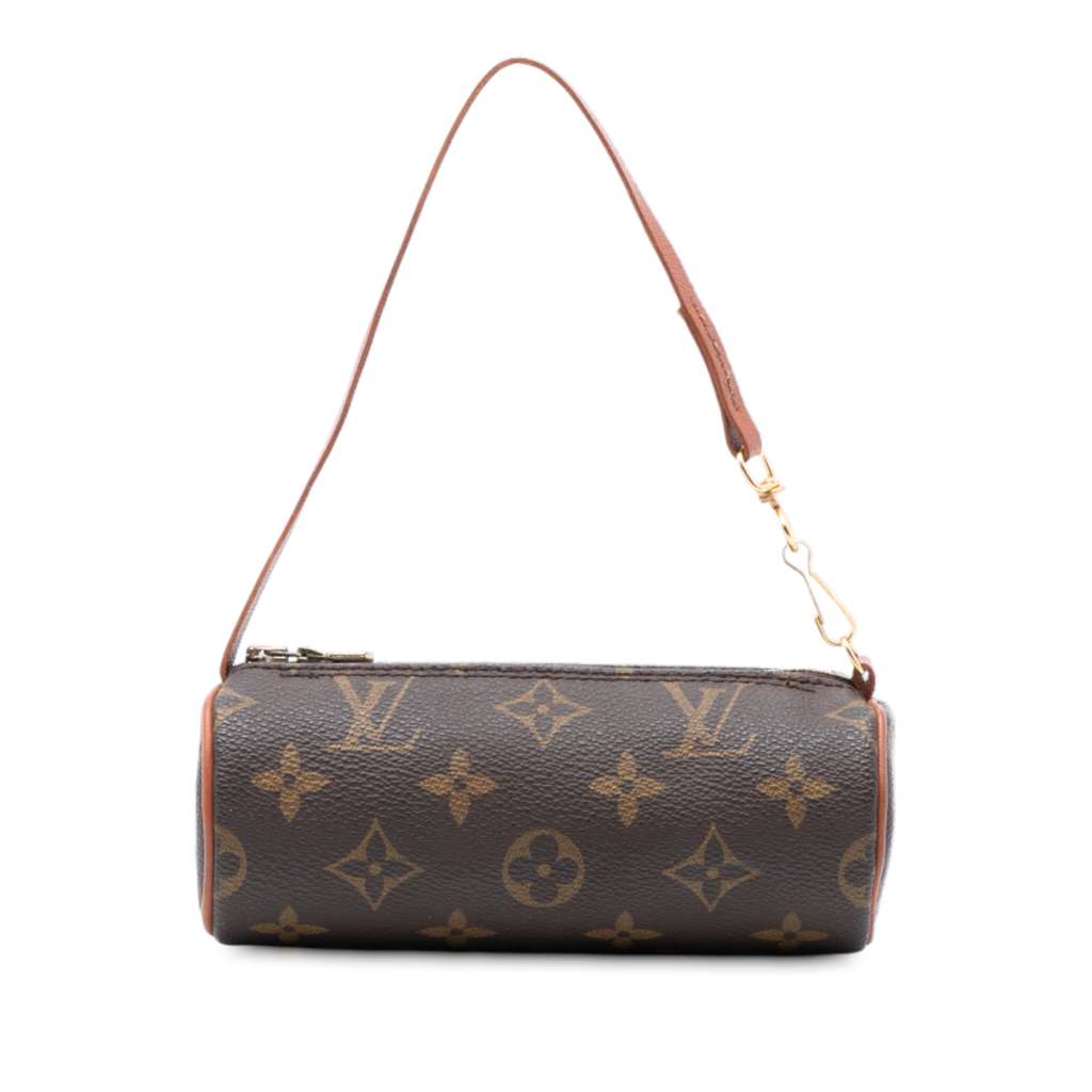 The Pochette Papillon features a monogram canvas body, a detachable leather strap, and a top zip closure.