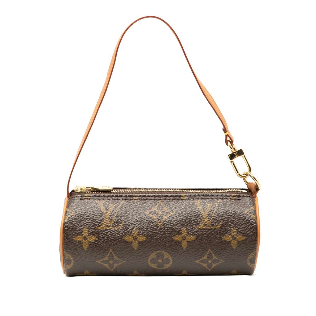 The Papillon Pochette features a monogram canvas body with leather trim, a detachable leather strap, and a top zip closure.