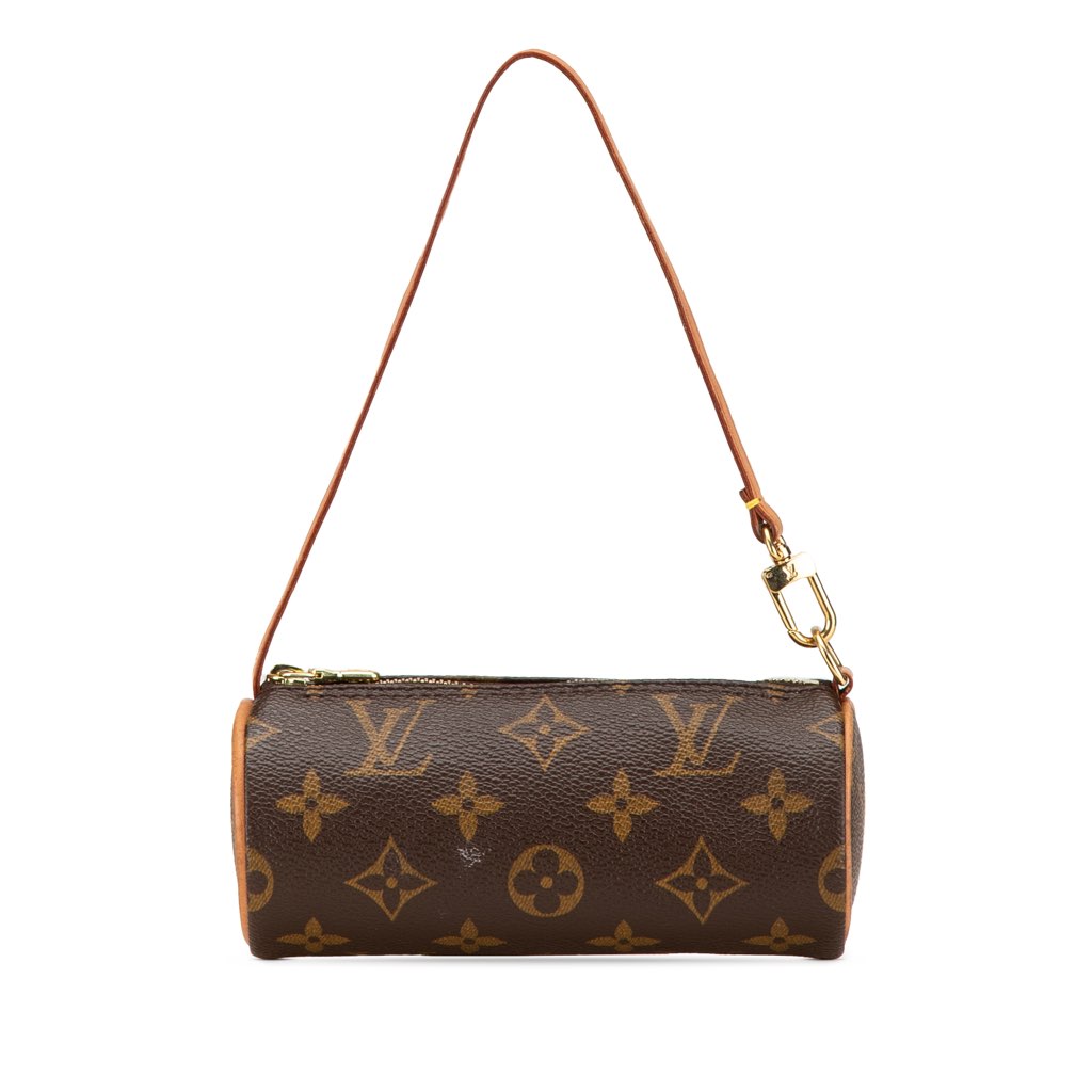 The Papillon Pochette features a monogram canvas body with vachetta leather trim, a detachable vachetta leather strap, and a top zip closure.