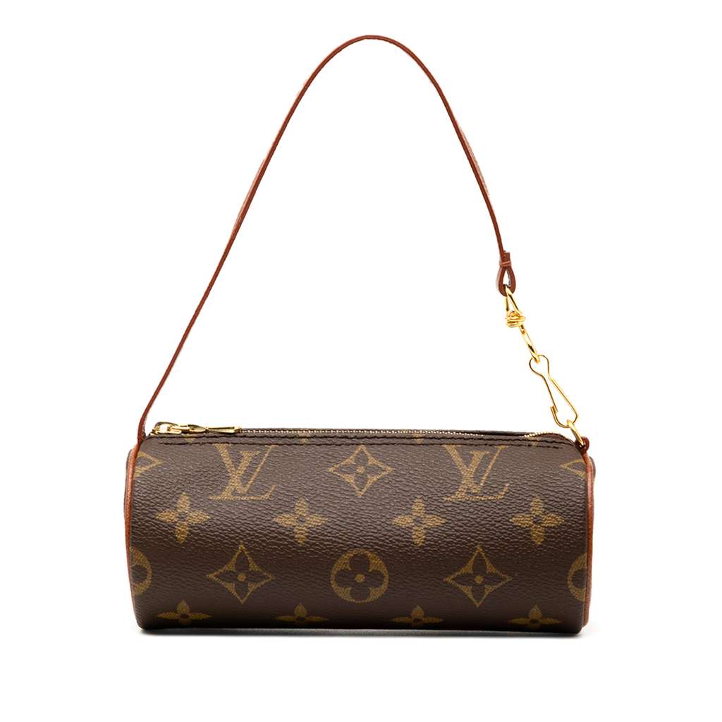 The Pochette Papillon features a monogram canvas body, a flat leather strap, and a top zip closure.