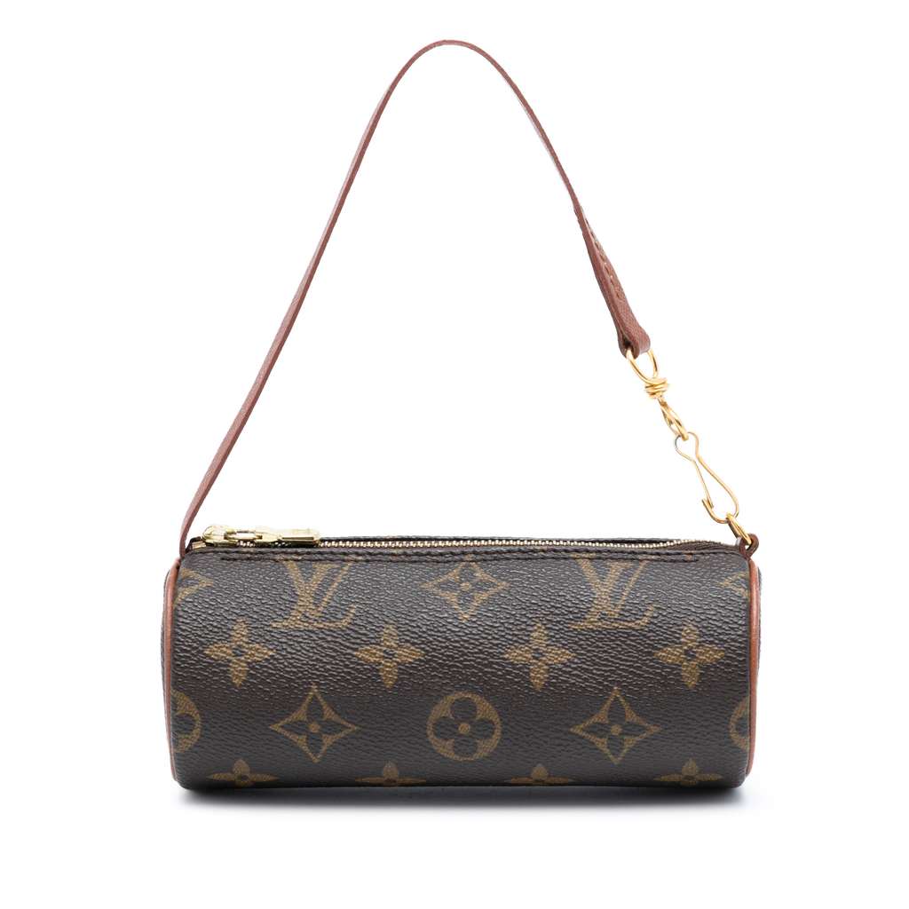 The Pochette Papillon features a monogram canvas body, a flat leather strap, and a top zip closure.