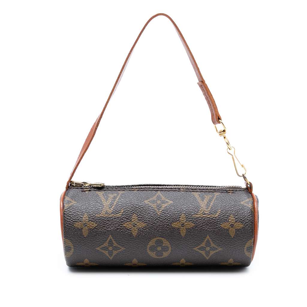 The Pochette Papillon features a monogram canvas body, a detachable leather strap, and a top zip closure.