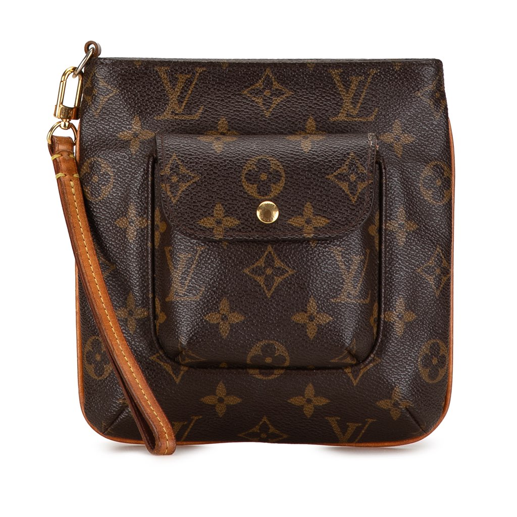 The Partition Clutch Bag features a monogram canvas body, a flat vachetta wrist strap, an exterior front flap pocket, and a top zip closure.