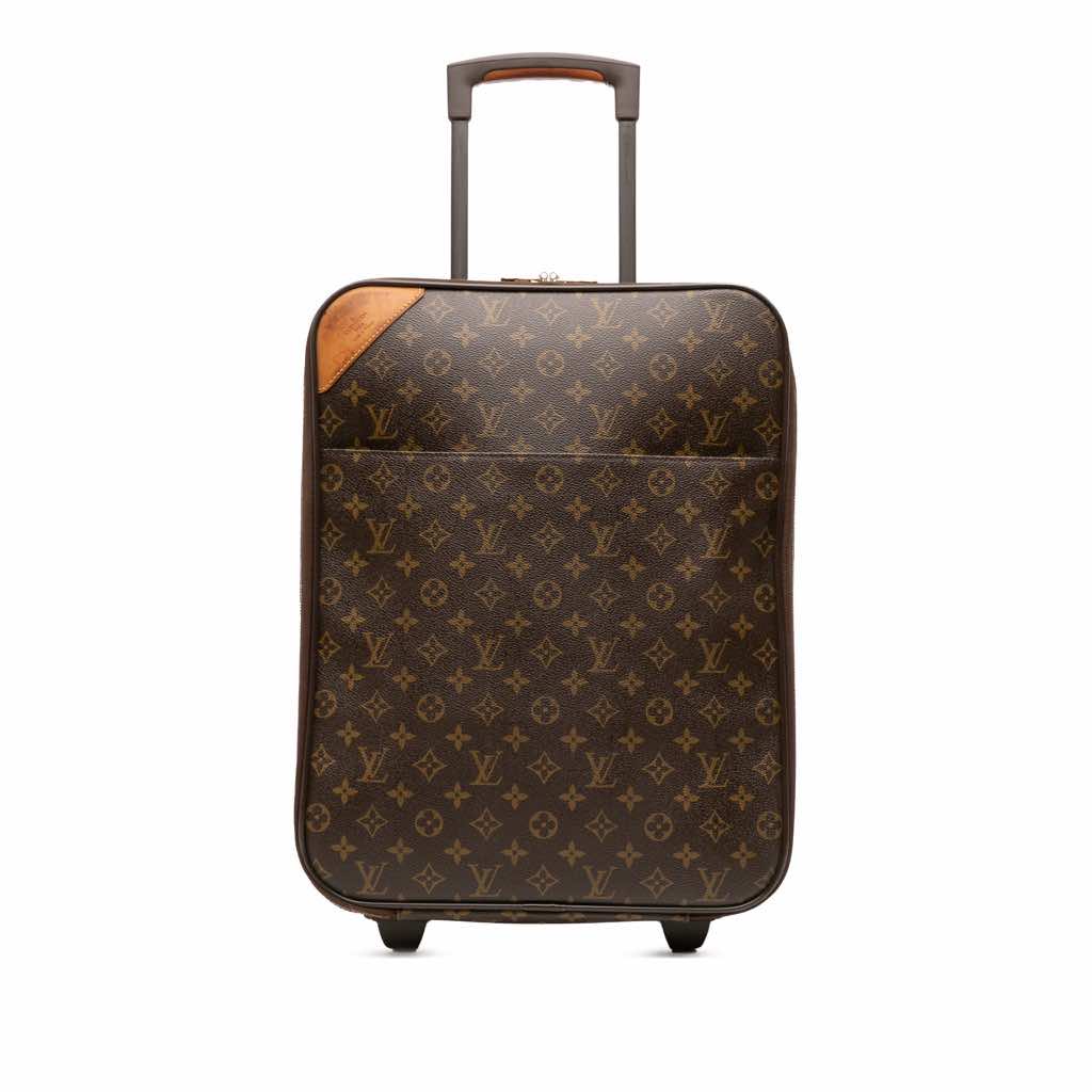 The Pegase 45 features a monogram canvas body, a flat vachetta leather top handle, a retractable top handle, dual wheels, a zip around closure, a front exterior slip pocket, and interior zip compartments.