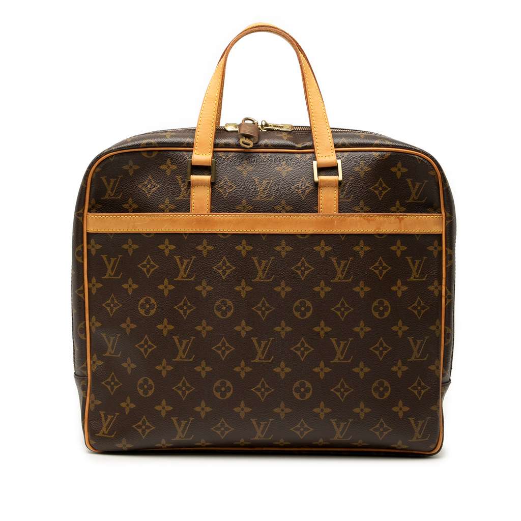 The Porte-Documents Pegase features a monogram canvas body with vachetta leather trim, flat leather straps, a top zip closure, and interior zip and slip pockets.