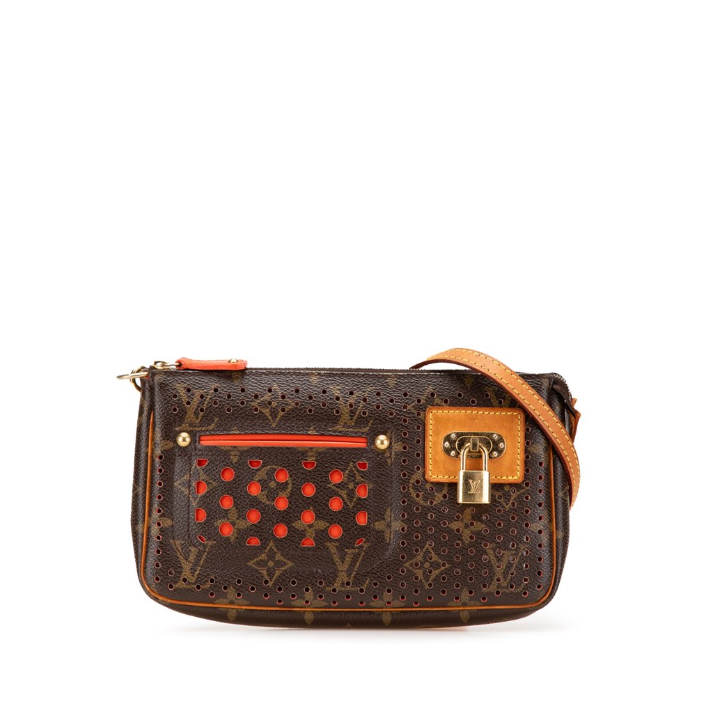 The Pochette Accessoires features a perforated monogram canvas body, a removable flat vachetta strap, a top zip closure, an exterior front slip pocket, and an interior slip pocket.