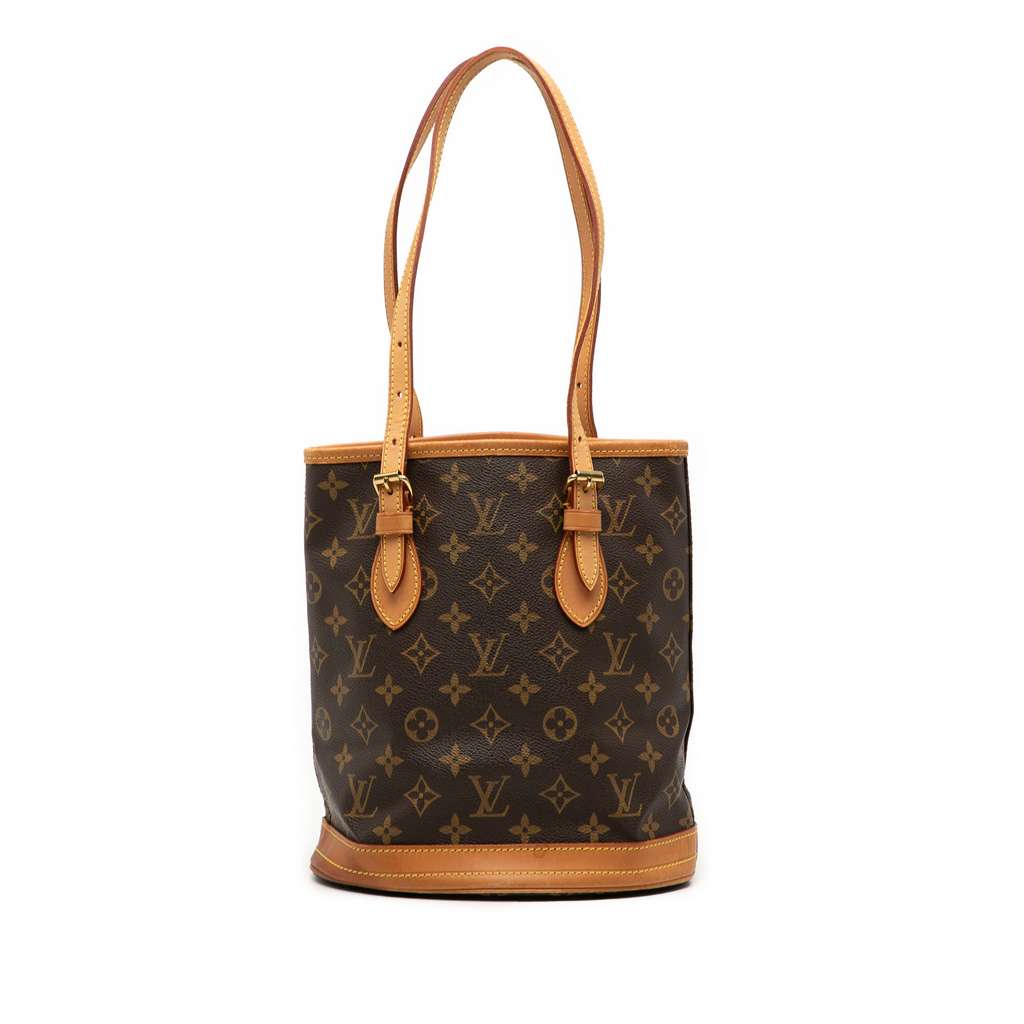 The Petit Bucket features a monogram canvas body with vachetta leather trim, adjustable flat vachetta leather straps, an open top, and interior zip and slip pockets.