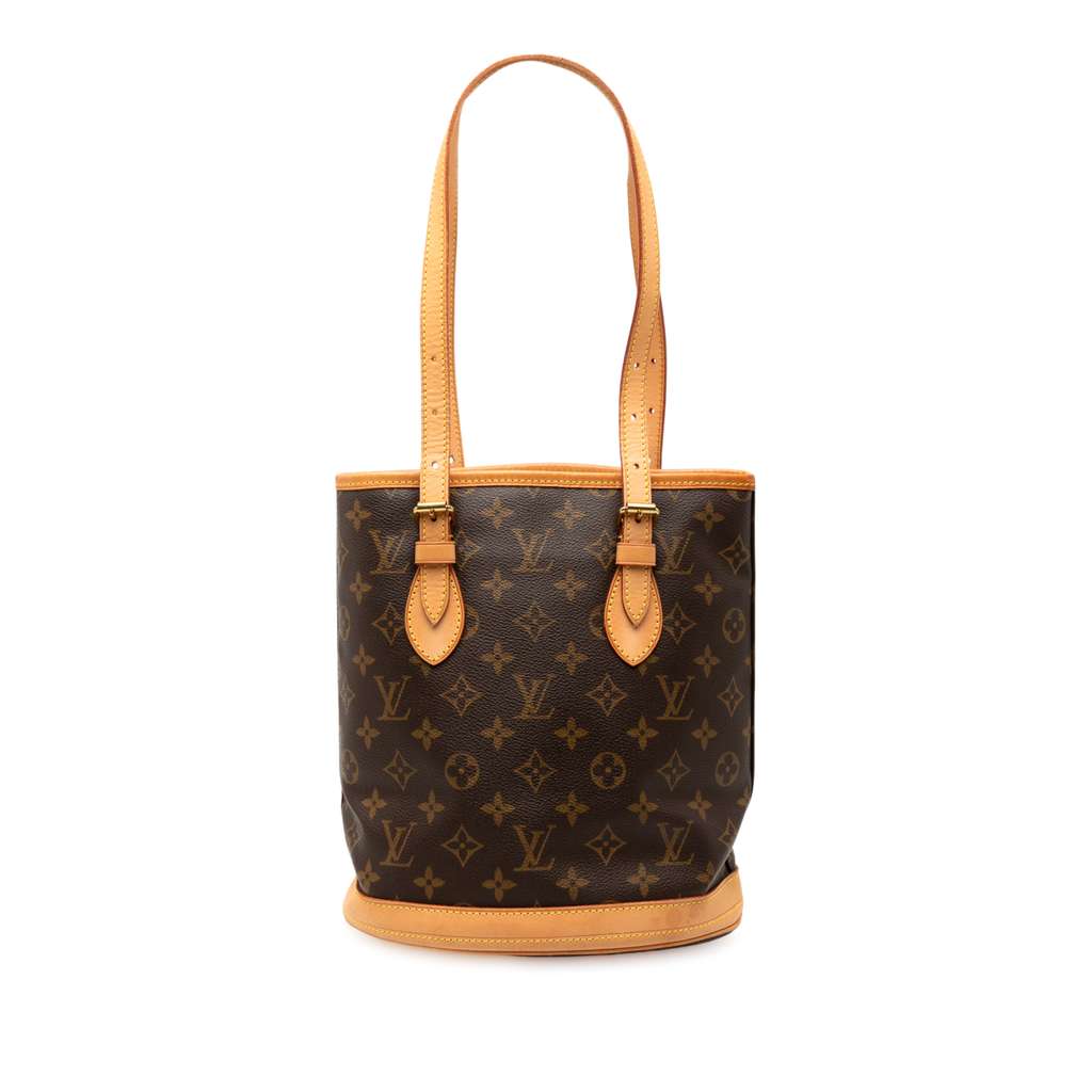 The Petit Bucket features a monogram canvas body with vachetta leather trim, adjustable flat vachetta leather straps, an open top, and interior zip and slip pockets.