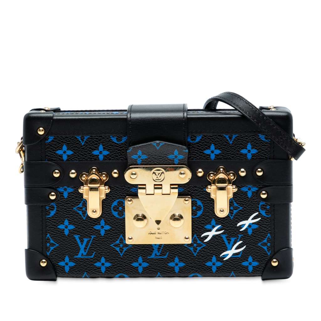 The Petite Malle features a monogram canvas body with leather trim, a detachable and adjustable flat leather strap, a front magnetic snap and S-lock closure, an interior slip pocket