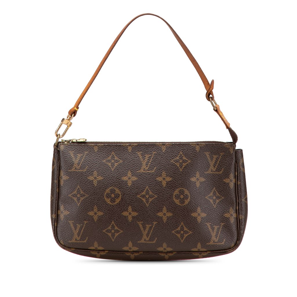 The Pochette Accessoires features a monogram canvas body, a flat vachetta leather handle, and a top zip closure.