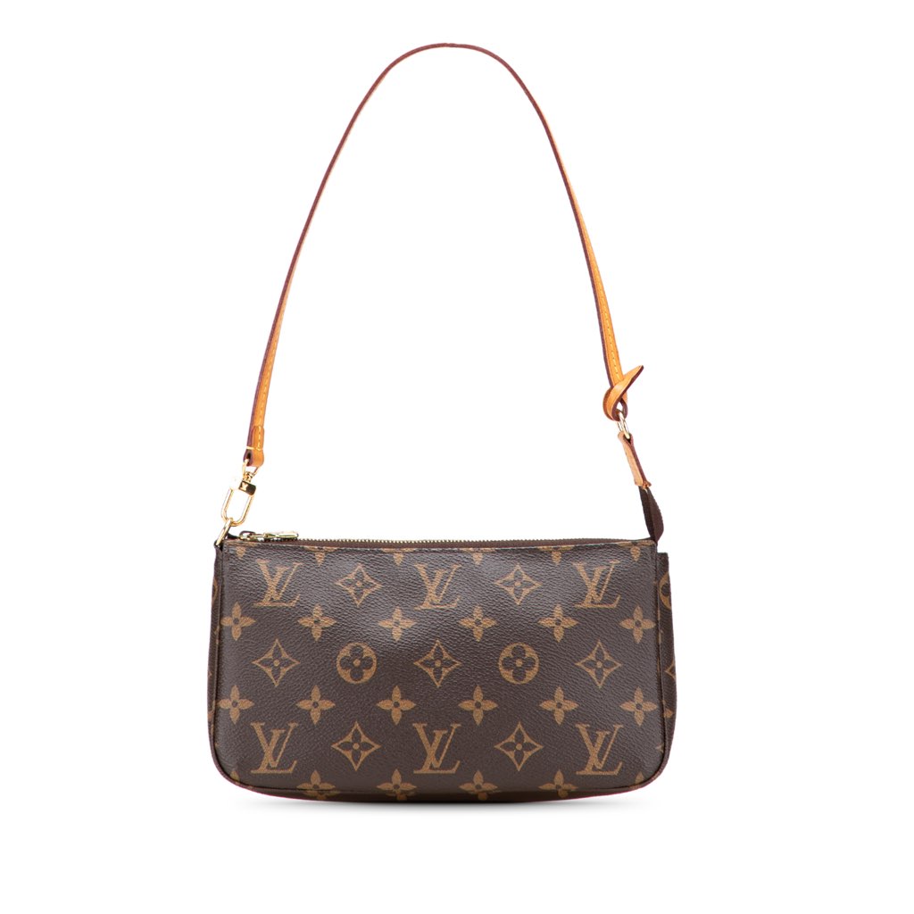 The Pochette Accessoires features a monogram canvas body, a flat vachetta leather strap, a top zip closure, and an interior slip pocket.