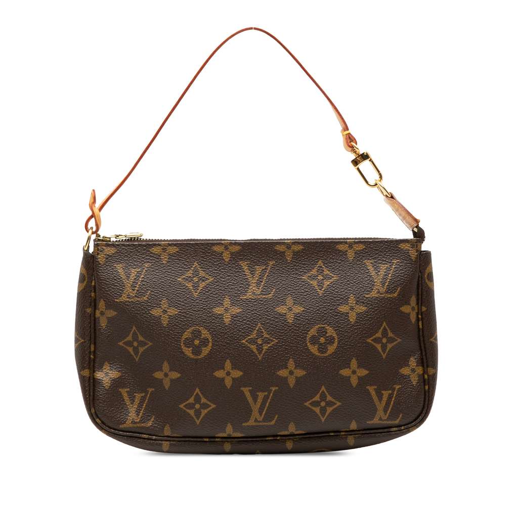 The Pochette Accessoires features a monogram canvas body, a flat vachetta leather handle, and a top zip closure.