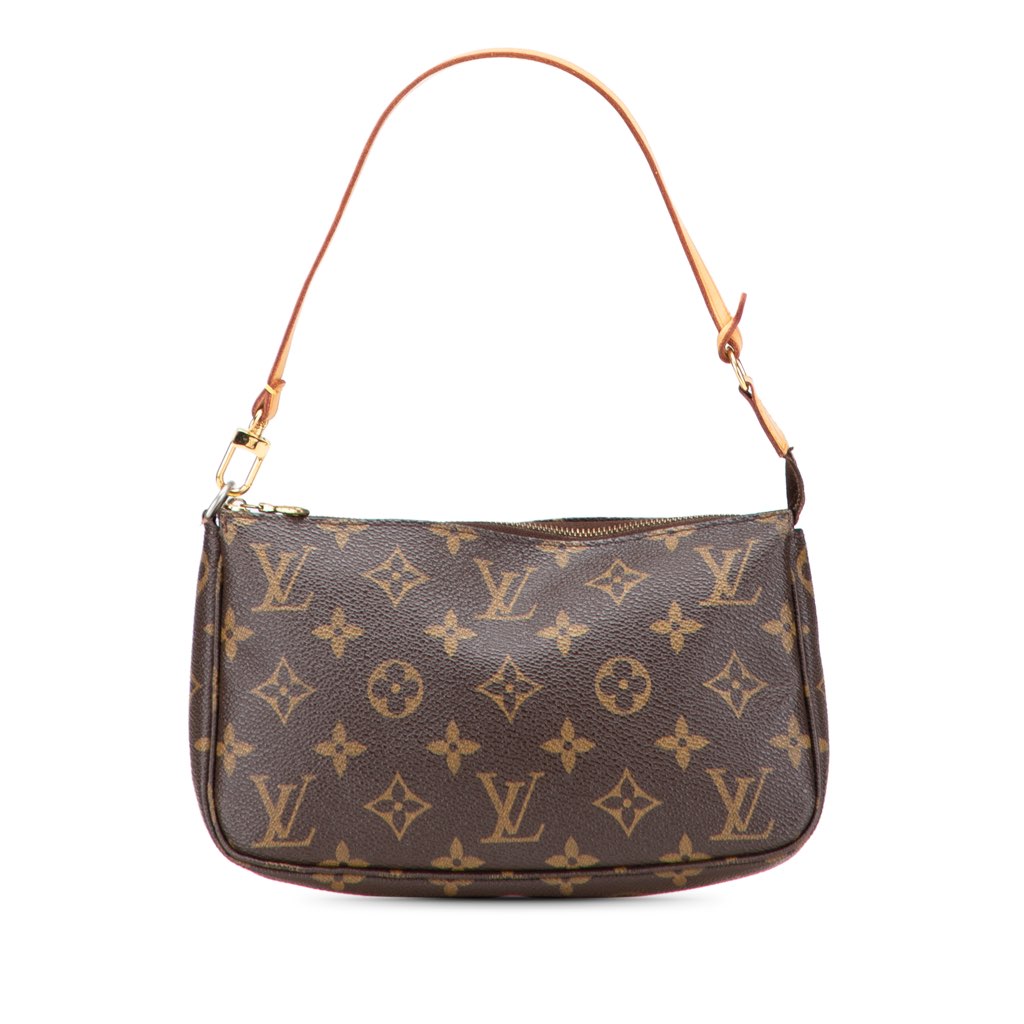 The Pochette Accessoires features a monogram canvas body, a flat vachetta leather handle, and a top zip closure.