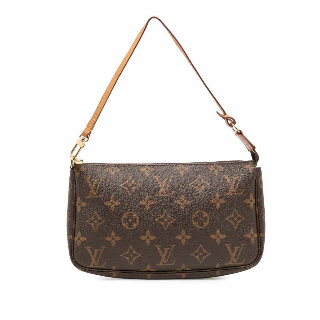 The Pochette Accessoires features a monogram canvas body, a flat vachetta leather strap, and a top zip closure.