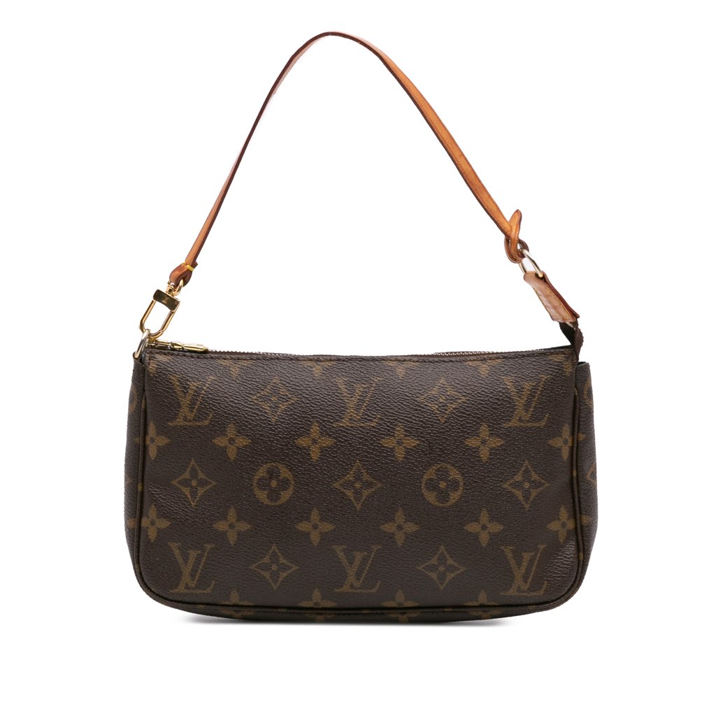 The Pochette Accessoires features a monogram canvas body, a flat vachetta leather strap, and a top zip closure.