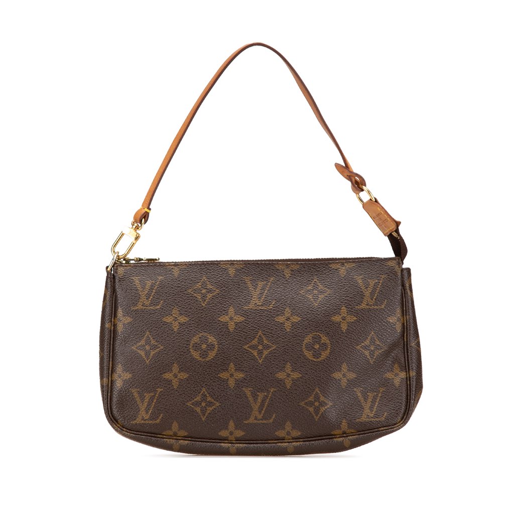 The Pochette Accessoires features a monogram canvas body, a flat vachetta leather handle, and a top zip closure.