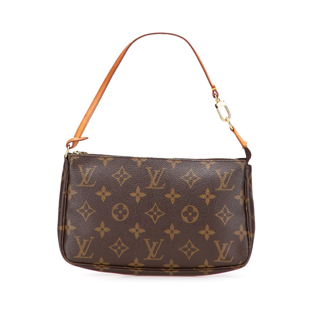 The Pochette Accessoires features a monogram canvas body, a flat vachetta leather handle, and a top zip closure.