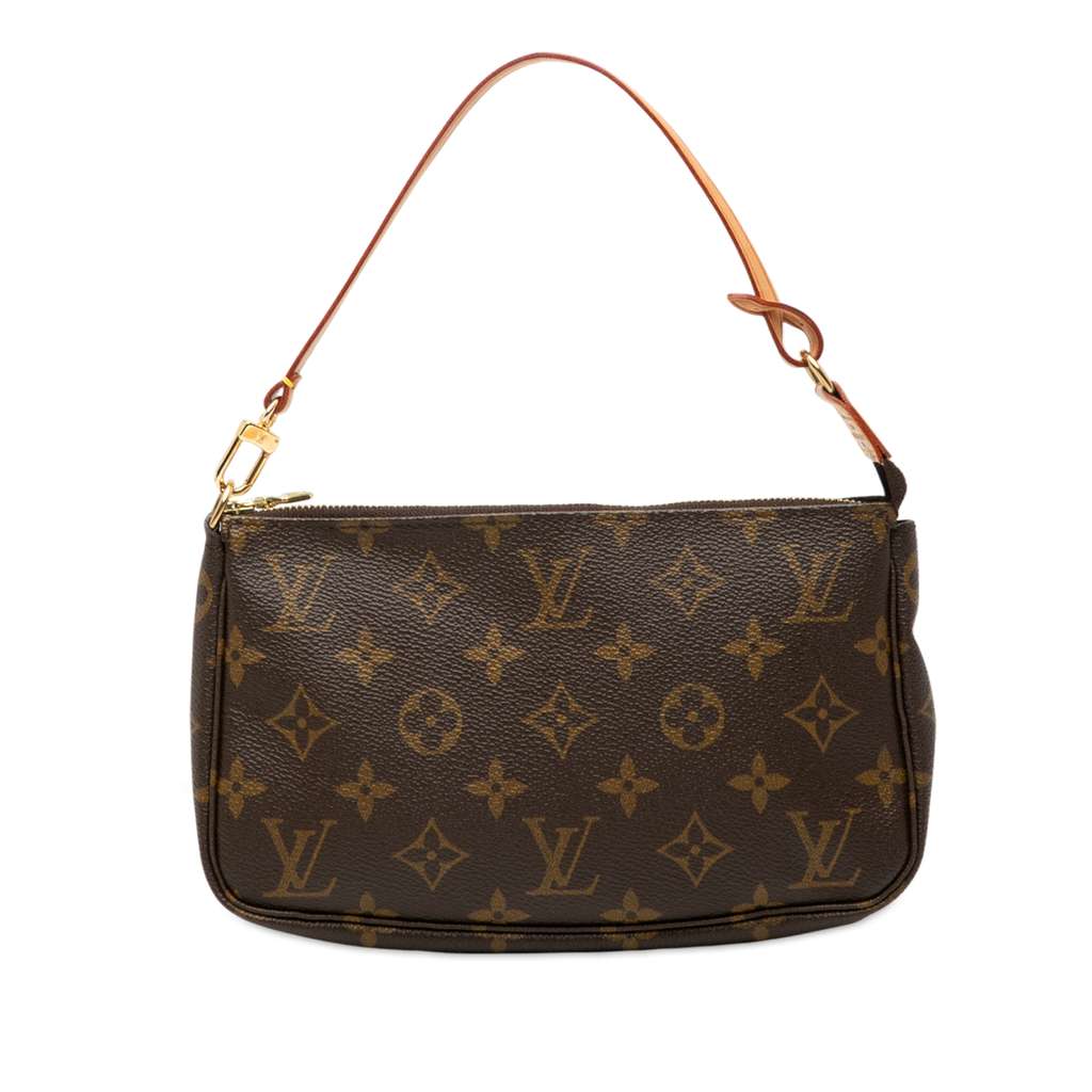 The Pochette Accessoires features a monogram canvas body, a flat vachetta leather handle, and a top zip closure.