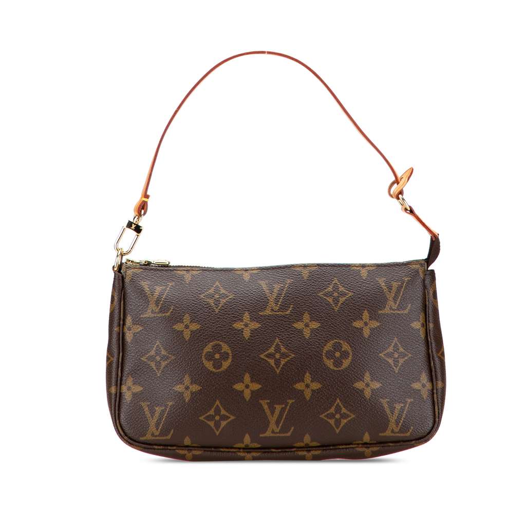 The Pochette Accessoires features a monogram canvas body, a flat vachetta leather handle, and a top zip closure.