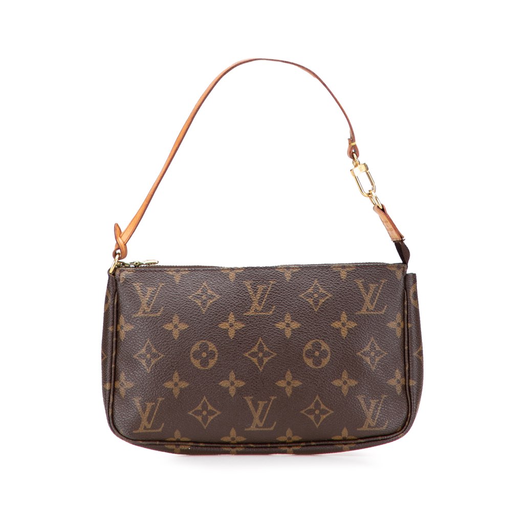 The Pochette Accessoires features a monogram canvas body, a flat vachetta leather strap, and a top zip closure.